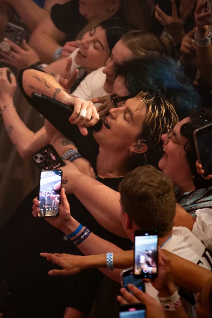 It’s impossible not to be pulled into the energy of a LANY concert and Paul Jason Klein is all about the fans. He spent the night reaching out, leaning into the crowd for hugs, and even made his way up to the first-floor balcony, where fans swarmed to catch a quick selfie or video. At one point, different fans handed him a pink high-vis jacket, a hat, and some sunglasses, and he wore them onstage, which made everyone cheer even louder. It felt so spontaneous and real—like he was just as excited to be there as we were.