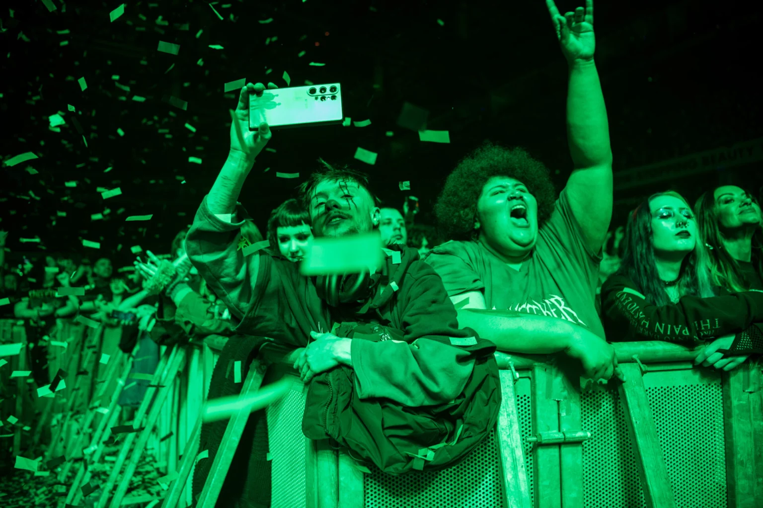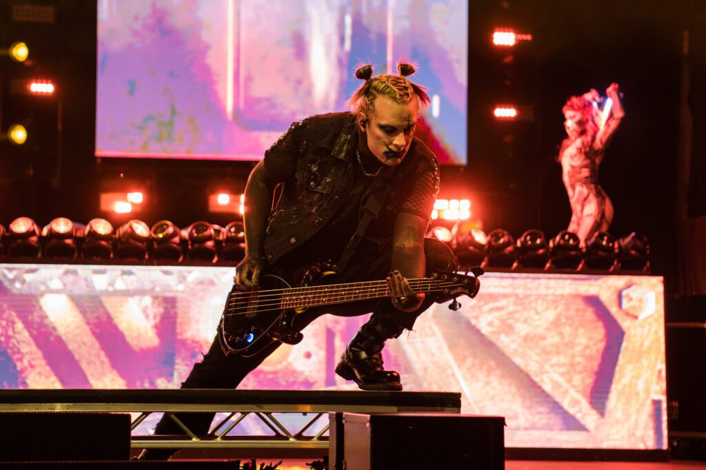 By the time Motionless in White appeared, the room was ready to explode. A spinning disco cat visual set a weirdly fun tone before flame dancers, confetti blasts and pyro took over. Chants of “you sexy bastard” rang out between songs, water guns cooled the front rows, and ‘Voices’ came wrapped in blue lights, pride flags and glowing lyrics behind the band. After a brief pause for a medical incident, handled with care and patience, the lights dropped low for new track ‘Afraid of the Dark’, complete with eerie sounds, werewolf visuals and crowd surfers flying from the back of the arena to the barrier.